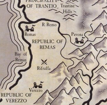 Verezzo jest przeciwieństwem Remas. Leży w głębi lądu, dominując na żyznej równinie z murami i wieloma bastionami. Miasto jest bardzo zwarte i zatłoczone ludźmi. Ulice są bardzo wąskie i kręte, a domy są budowane bardzo wysoko z powodu braku miejsca. Niektórzy wznieśli się tak wysoko, że stali się wieżami wbudowanymi w obronę. Powodem tego jest to, że ściany są tak mocne i zajmują tak dobry punkt obserwacyjny na jedynym wznoszącym się terenie w promieniu wielu kilometrów, że obywatele niechętnie je zmieniają.