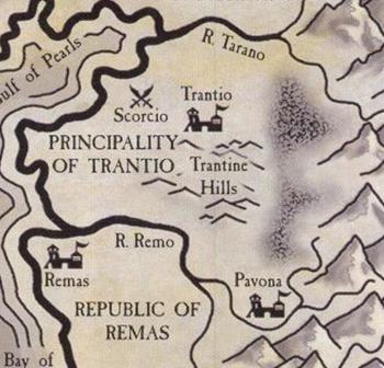 Księstwo Trantio wiele wieków temu wcale nie było potężnym miastem. Usytuowany w górzystej okolicy w głębi lądu był nieco zacofany i nie prosperował zbyt dobrze z handlu. Było to jedno z pierwszych miast, które obaliło księcia i stało się republiką. Ta republika trwała długo, ale ostatecznie stała się dekadencka. Jednak wszystkie próby zdobycia miasta przez armie najemników z Remas i Miragliano zostały udaremnione przez republikę nagle zmieniającą strony w odpowiednim momencie. Trantio zyskał sławę dzięki rywalizowaniu ze sobą rywali w celu zachowania niezależności. Wszystko zmieniło się, gdy Marco Colombo wrócił z Lustriiz ogromnym bogactwem. Przejmując armię najemników swojego patrona, Orlando, wygnanego księcia Trantio, udało mu się zdobyć miasto i zostać jego księciem.