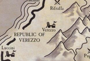 Podobnie jak Remas, Verezzo stało się republiką w wyniku wielkiego głodu. Książę zebrał zboże i próbował sprzedać je mieszkańcom po wygórowanej cenie. Wkrótce został obalony z władzy przy pomocy najemników i ogłoszono republikę. Republika Verezzo jest znacznie bardziej demokratyczna niż Remas, prawdopodobnie dlatego, że istnieje tak wiele rodzin kupieckich, a każdy, kto ma aspiracje do wielkiej władzy, może pokusić się nawet zabójstw na kliku różnych płaszczyznach. W Verezzo istnieje rozbudowany system głosowania, w którym rodziny kupców są podzielone na frakcje wyróżniające się kolorami głosowania (czerwonymi, zielonymi, błękitnymi i żółtymi).