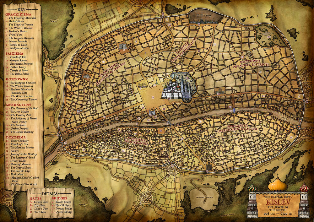 Miasto położone jest nad brzegiem rzeki Urskoy, w dopływie Talabec. Ze względu na swoje położenie na Urskoy, leży praktycznie na granicy z Imperium, a wiele zwyczajów i obyczajów estetycznych imperium wpłynęło na życie, literaturę i architekturę Kislevu. W centrum Kislevu znajdują się Pałace Bokha, dziedziczna siedziba władzy odbudowana za panowania cara Borisa Bokhy po tym, jak oryginalny Pałac został prawie całkowicie zniszczony podczas Wielkiej Wojny z Chaosem.