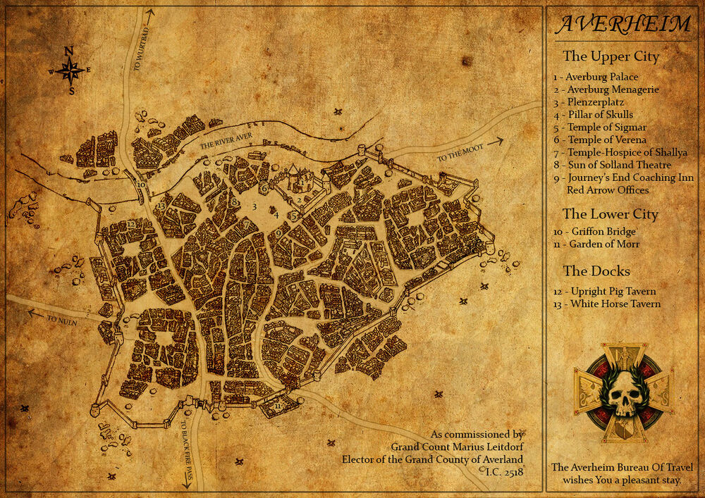 Na tle miasta wyróżnimy zamek Averburg, obok niego wielki, brukowany plac targowy, znajdujący się w bliskim sąsiedztwie zamku. W jego centrum znajduje się Filar Czaszek, a sam teren wypełniony jest straganami z różnorodnymi dobrami.